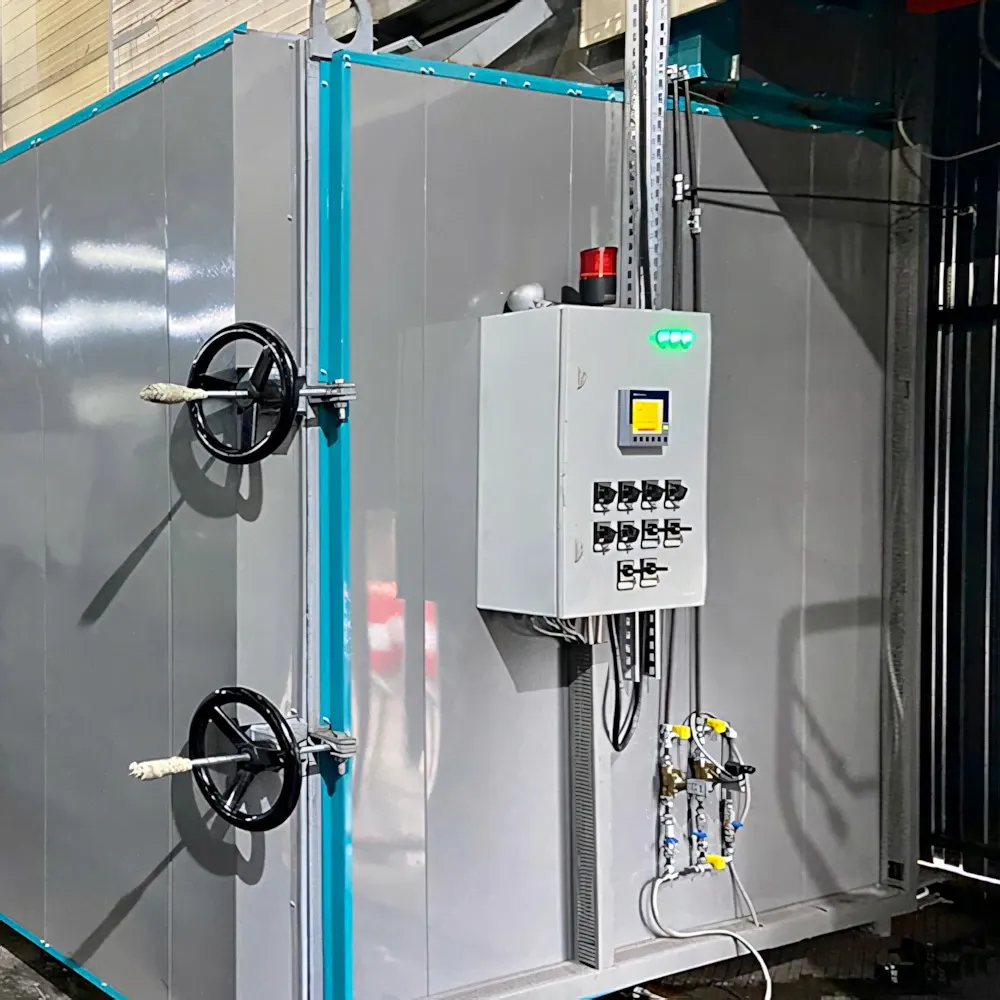 Kontrollü askı temizleme fırınları, temel olarak primer temizleme odası içinde (425°C – 485°C) sıcaklık ile çalışan proses fırınlardır. Askı temizleme fırınlarımız, toz boya, yaş boya, kataforez kaplama, gres, cila, kauçuk, plastik, motor blokları, ekstrüzyon kalıpları, eşanjörler veya diğer metal parçaların temizliğini yapmaktadır.